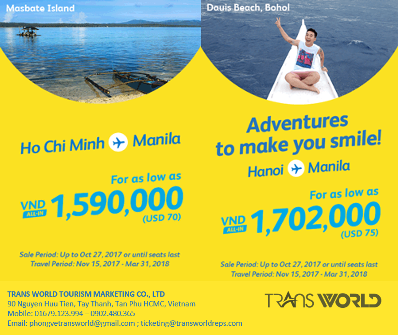Đặt ngay vé rẻ cũng Cebu Pacific từ hôm nay đến 27/10/2017 cho các hành trình khởi hành từ 15/11/2017 đến 31/3/2018