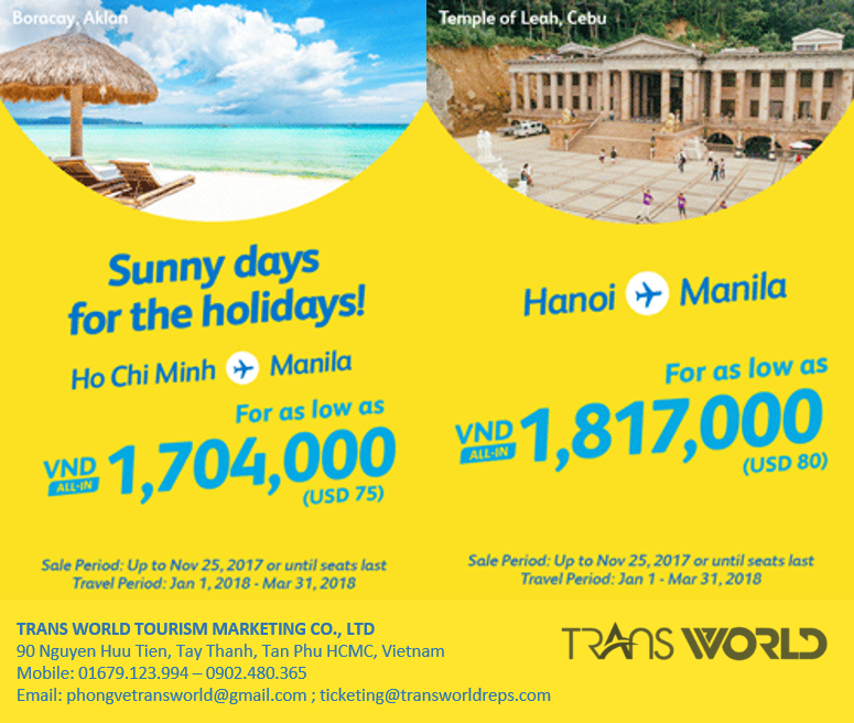 Bạn thoải mái đặt vé rẻ từ Hồ Chí Minh/ Hà Nội đến Manila với giá chỉ từ: 1704.000/chiều (đã bao gồm thuế phí đầy đủ)